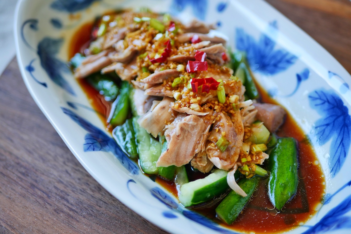 - 撕雞腿肉 雞腿肉煮熟後取出,放至涼,徒手將整隻雞腿的肉撕成條狀,堆疊在黃瓜上,最後再把做好的淋醬倒上去,就完成了。