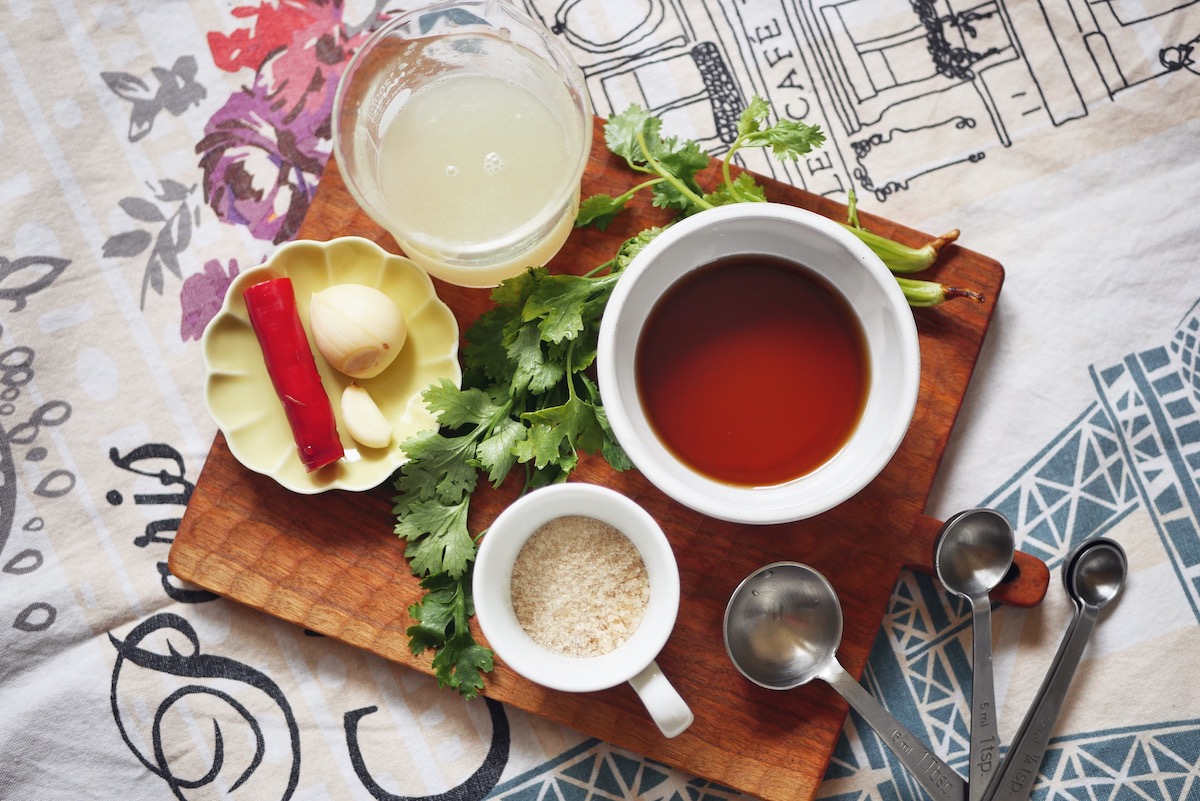 若家中沒有魚跟雞高湯,也可以用開水替代。把擠好的新鮮萊姆汁先與水調和,再加入糖使其先溶解,接著再把魚露加進來,攪勻;最後把剛剛備好的辛香料理全倒進來攪和。
