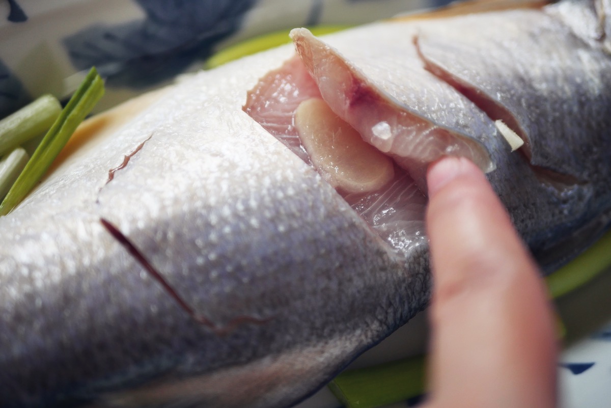 魚洗淨,在魚身兩面分別劃上三刀,先下直刀再把刀子歪一下斜切碰到魚骨就停刀,這樣魚肉易熟,然後抹薄鹽,在劃刀的魚肉也抹一點,鹽量不要多,並塞片薑片。