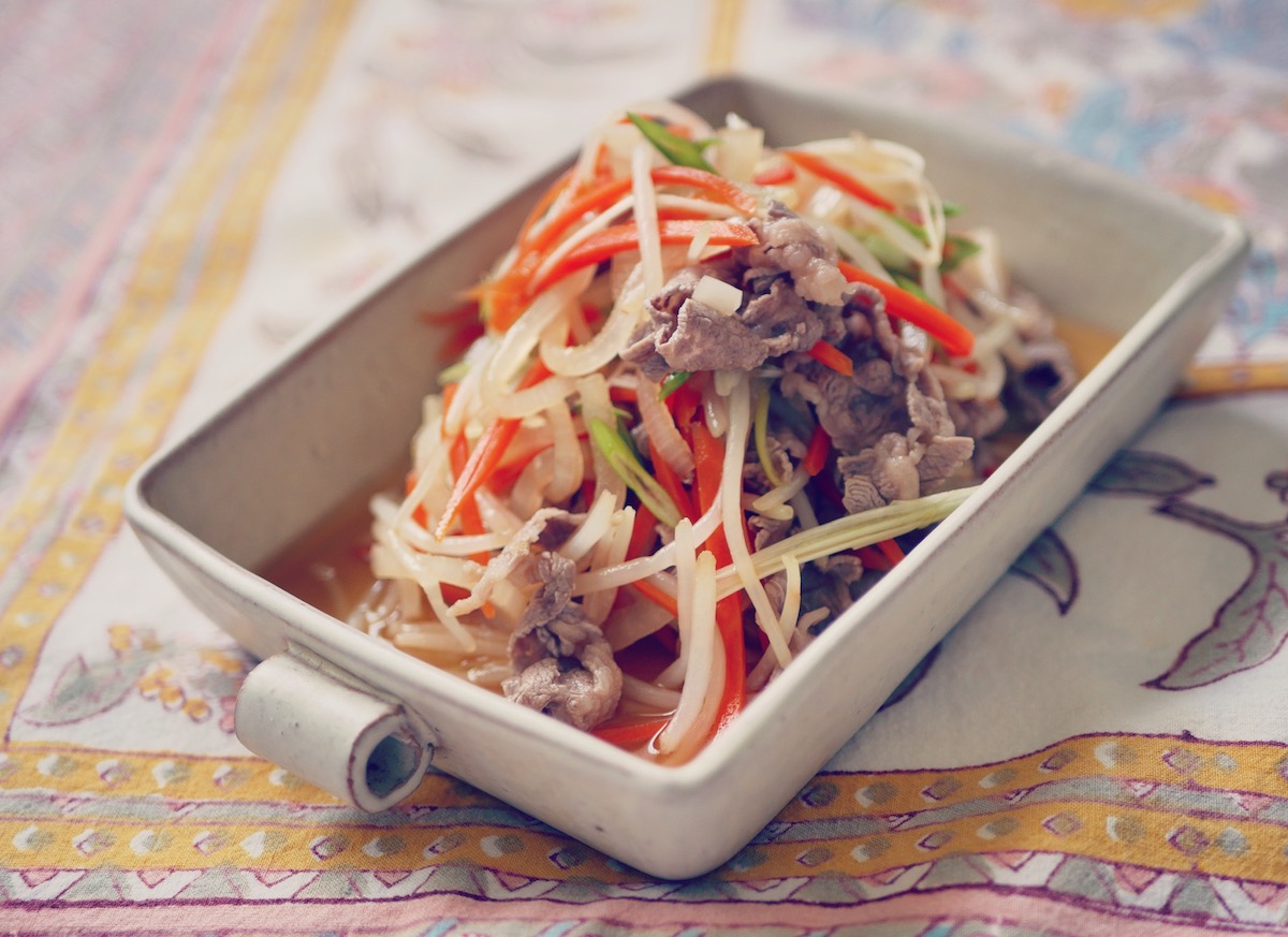 這醬料的味道實在很特別,有柚子香又有梅子味, 醬油味倒是淺淺淡淡的,但全部融合在一起又很和諧, 它有點是淡味的昆布柴魚醬油,加上水果的清香調; 買回家後,突發奇想做了一道溫拌的鮮蔬牛肉料理, 沒想到搭配起來的味道還不錯,且做法也相當簡單。