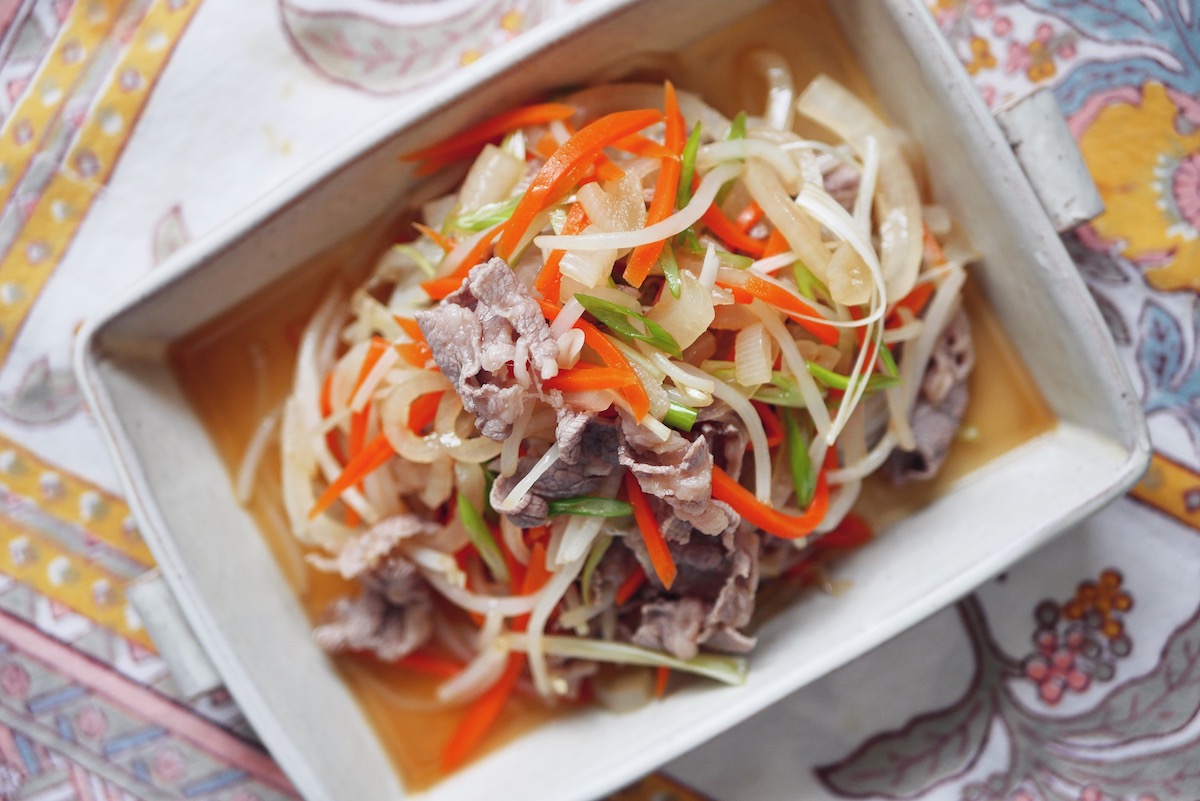 - 燙牛肉 蔬菜撈起來後,再來汆燙牛肉片,肉很快就熟了,只要看到肉變色就可以起鍋。